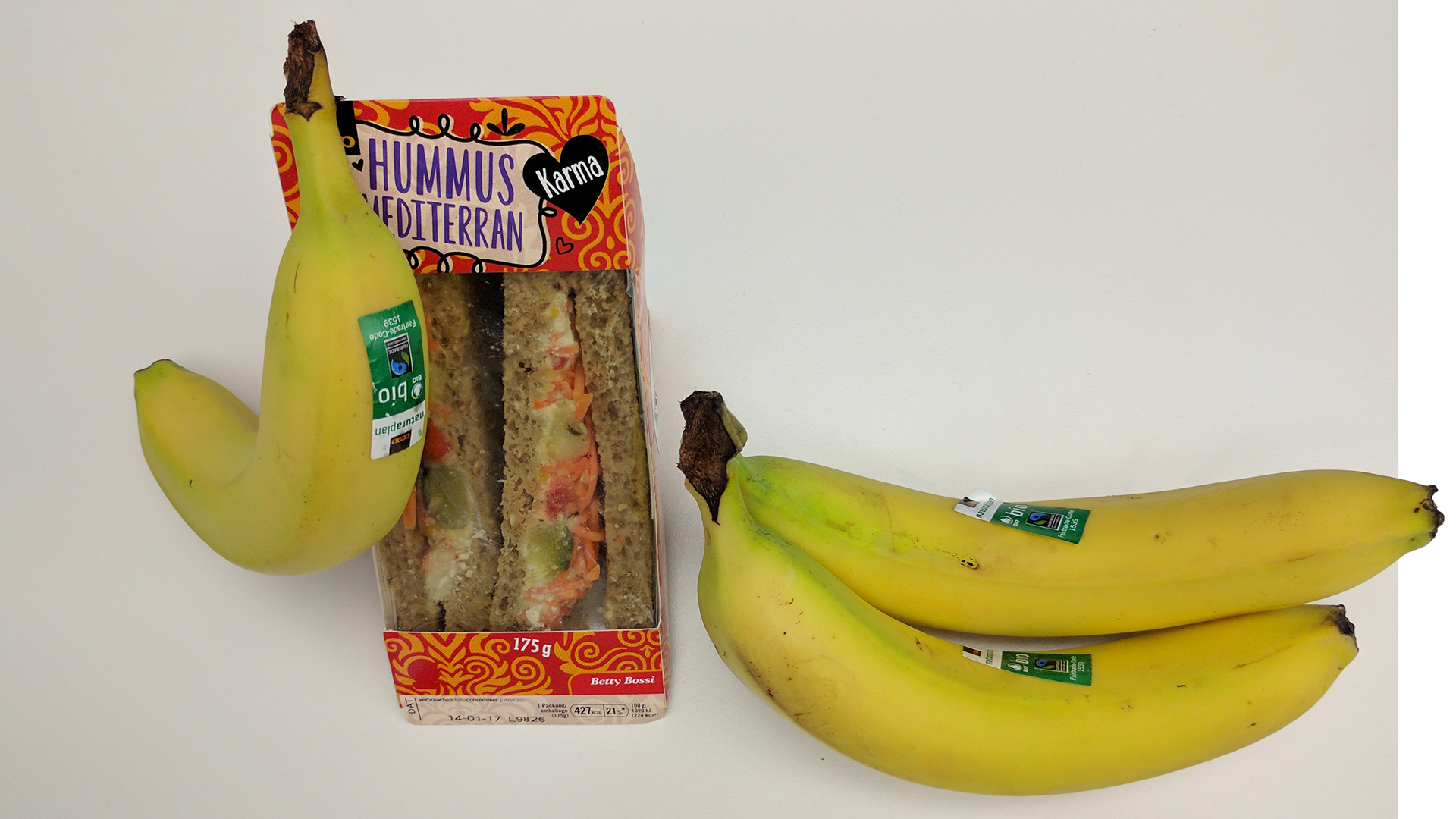 Es soll eigentlich ein ganz normaler Tag werden. Nur vegesse ich, nachdem ich keinen Zmorgen gegessen habe, auch den Znüni. Um zehn nehme ich an einer Präsentation teil, da bekomme ich Bauchschmerzen. Trotzdem esse ich erst nach zwölf. Den Znacht von gestern konnte ich heute nicht mitnehmen. Ausser ich würde das - sonst aufgeweichte - Brot erst jetzt mit frisch zubereiteter Füllung schwängern. Kochen in der Cafeteria? Ich sitze lieber mit den anderen am Tisch und unterhalte mich. Da kommen das Hummussandwich und die Banane recht gelegen.
