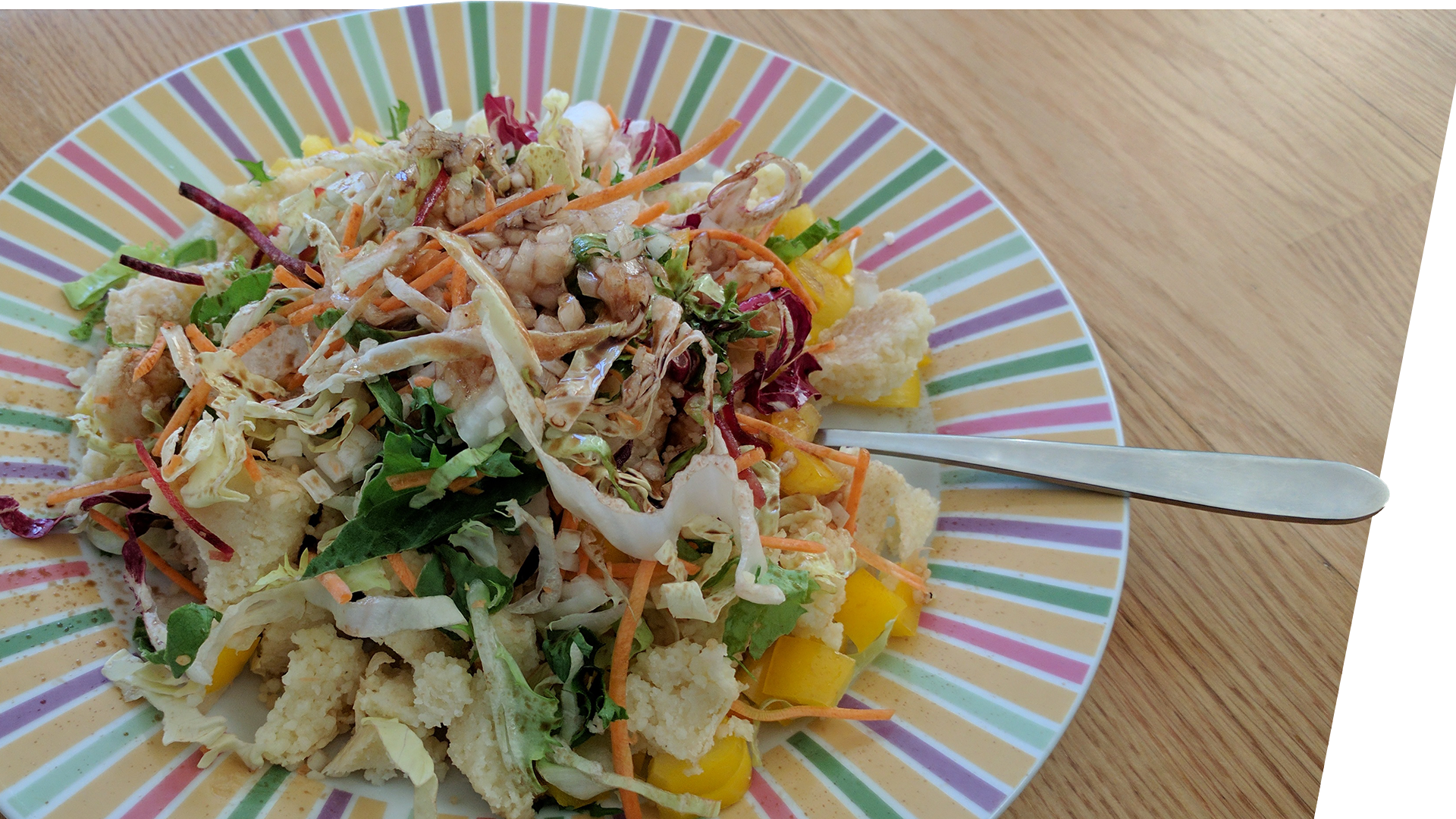 Dann der Hunger. Als ob ich nichts gegessen hätte. Und dann fällt mir auf - schon 15:00 Uhr - also gerechtfertigte Leere im Bauch. Schnell den Couscous von gestern Abend in einen Teller, Zwiebeln und Peperoni schnibbeln und mit buntem Salat auf das schlussendlich wilde Gericht. Italienische (vegane) Salatsauce drüber und dann nochmal mit Aceto besprühen. Gefüllt hat es mich bis zum Anschlag, schmeckt gut und mit Brot eine fantastische schnell zubereitete Mahlzeit. Aber trotzdem muss morgen mal entwas anderes her...