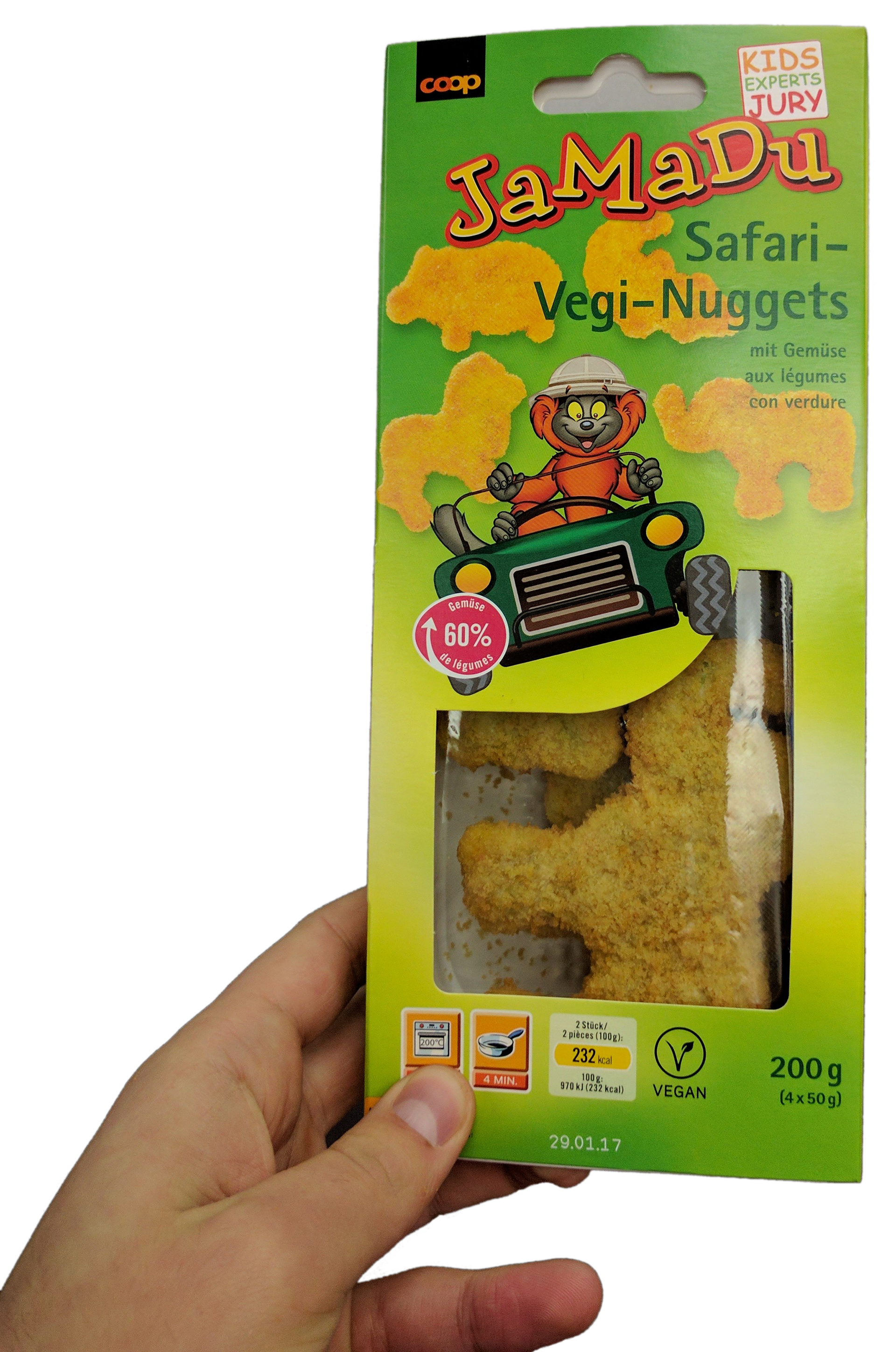 Darüber gibts Tomatensauce und daneben Vegi-Nuggets in Tierform.