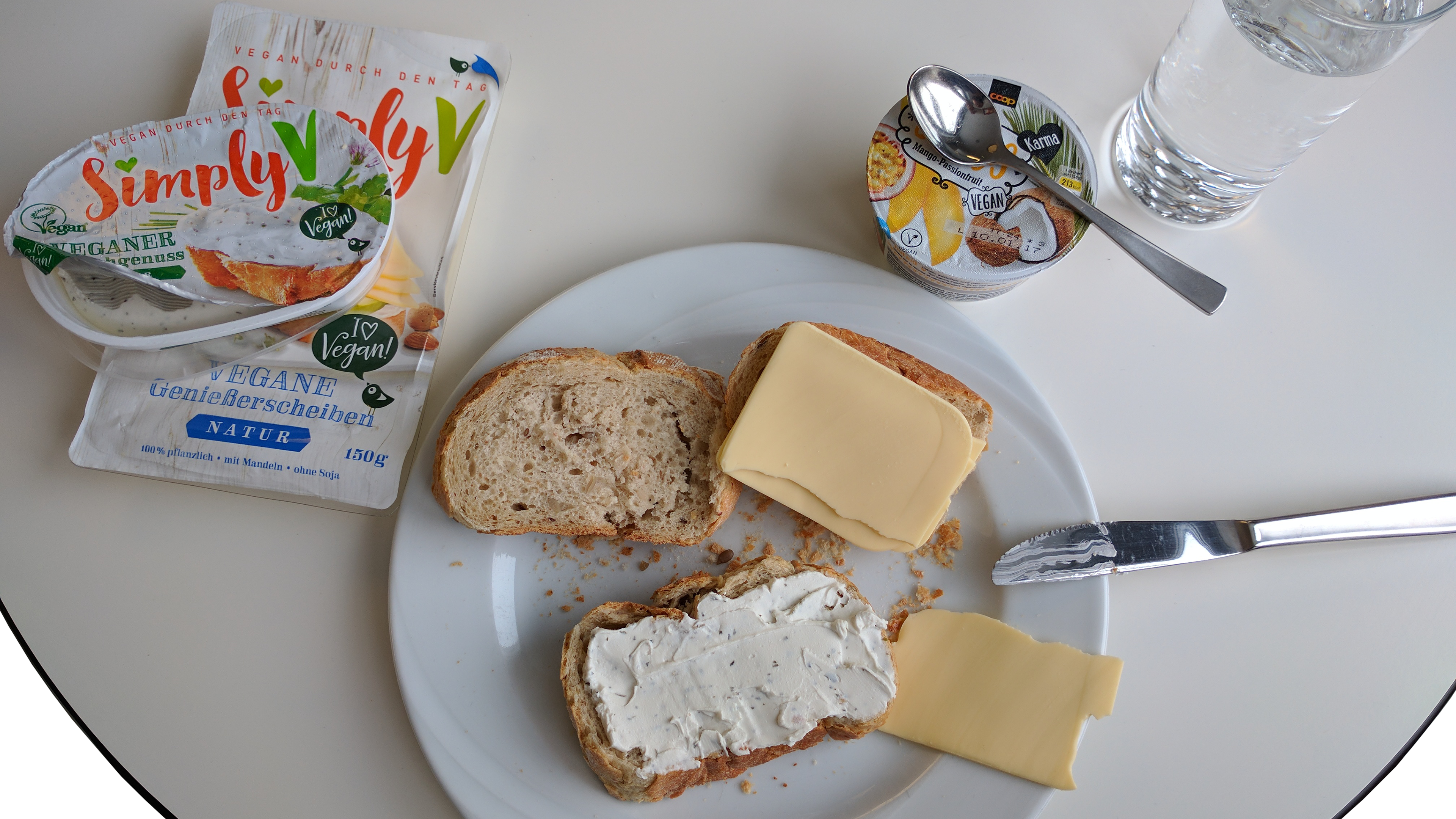 Auch Brot von gestern habe ich mitgenommen, welches ich mit veganem Käseersatz belegen werde. Dazu noch «Streichgenuss», was wohl einem Streichkäse gleichkommen soll. Beides enthält zu grossen Teilen Mandeln und Kokosnuss, weshalb es mir als Nuss-Meider nicht besonders schmeckt…